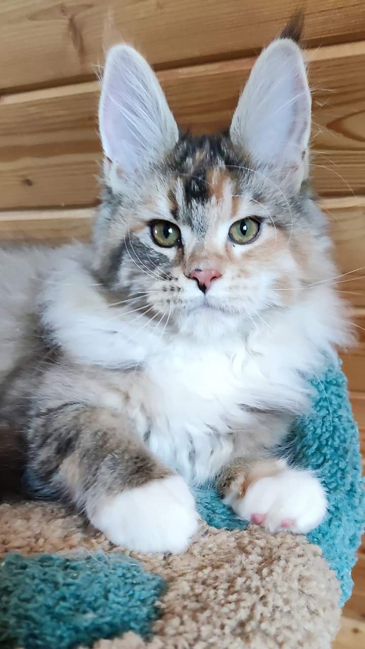 Meet Daphna, a delightful female European Maine Coon showcasing a striking Calico coat and captivating gold eyes. Daphna's unique traits include very long lynx tips, a rare color pattern, and an irresistibly fluffy appearance. Anticipated to weigh 18-19 lbs when fully grown, Daphna is not just a beauty but also an affectionate, acrobatic, and curious companion. Daphna loves being around you, gets along well with other pets, and currently relishes the delectable Pro Plan Chicken Rice Kitten. Litter-trained and arriving intact, Daphna is ready to bring her charm, curiosity, and acrobatic antics to your home. Don't miss the chance to welcome Daphna into your family