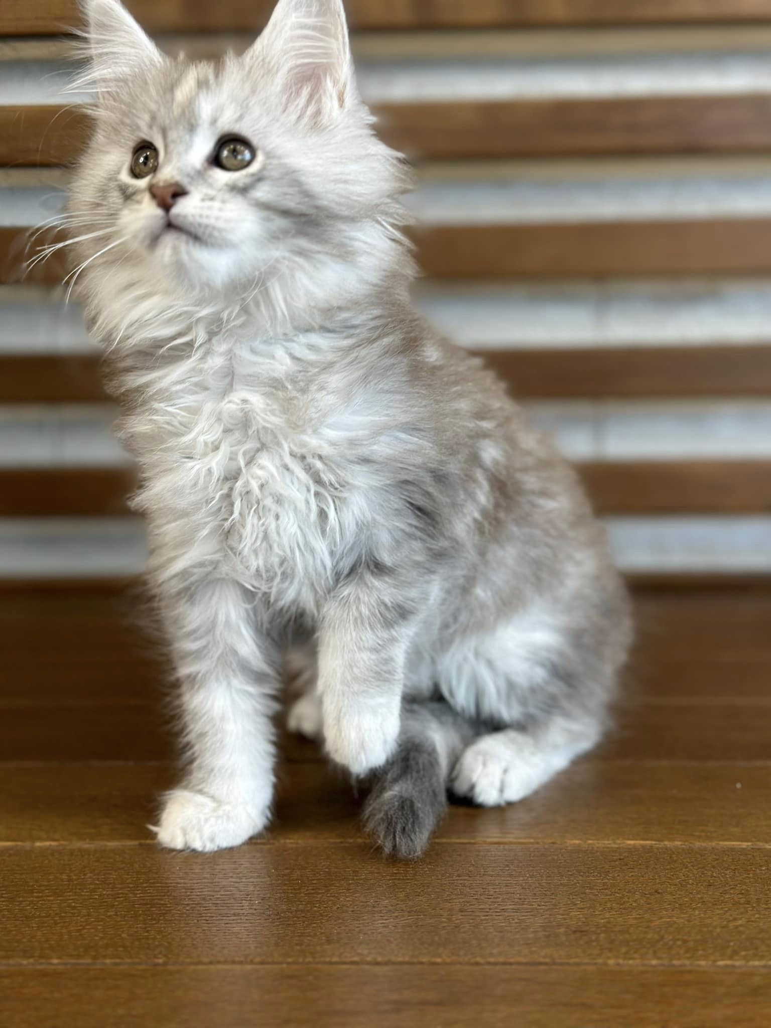 Meet Mojo, a male European Maine Coon kitten with a sleek Shaded Black Smoke coat and stunning green eyes. Mojo is a one-of-a-kind feline with some unique traits: he boasts the most rare and unique coloration in the world, comes from champion bloodlines, and has a larger size that adds to his charm. When fully grown, he's expected to weigh around 23-27 lbs, inheriting these exceptional traits from his parents, whose pictures you'll find after checking out Mojo's adorable images. Mojo isn't just a unique-looking kitty; he's got a fantastic personality too. He's affectionate, great with other pets, and always very curious about his surroundings. Whether you have other animals or not, Mojo will fit right in. Currently, Mojo is happily indulging in Pro Plan Chicken Rice Kitten food, and he's already a pro at using the litter box. When he comes home to you, he'll be neutered and ready to bring his rare beauty, affection, and playful curiosity into your family. Don't miss out on making Mojo a part of your home