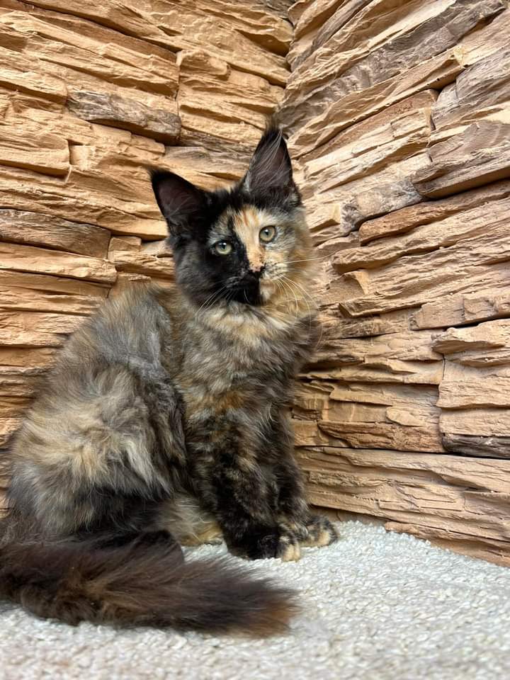 BREED: / Maine Coon KITTEN NAME: / Aura SEX: / Female COAT COLOR: / Calico EYE COLOR: / Grey & Gold AGE: / 12 Weeks WEIGHT: / 7.2kg READY TO GO: / Yes HEALTH CHECK: / 100% Completed before departure. NUMBER OF KITTENS PER LITTER: / 7 WILL PROVIDE CONTRACT OF SALE: / Yes REGISTERED: / Yes